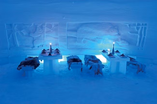 Snow Restaurant - Kemi, Phần Lan. Nhà hàng được xây hoàn toàn bằng tuyết (được xây dựng lại mỗi năm, mỗi lần trông có vẻ khác) này nằm ở LumiLinna Snowcastle, Kemi, Phần Lan. Cả bàn ghế cũng được làm bằng từ băng, thực khách sẽ ăn uống ở nhiệt độ -5 độ.