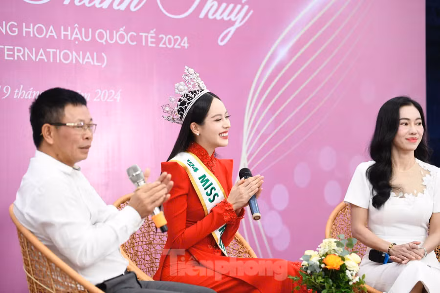 Xuất hiện rạng rỡ tại buổi giao lưu, Hoa hậu Huỳnh Thị Thanh Thủy bày tỏ niềm xúc động trước sự đón tiếp nồng nhiệt của báo Tiền Phong cùng các cơ quan thông tấn báo chí. Cô cho biết vui và bồi hồi khi lắng nghe bài phát biểu của Tổng biên tập báo Tiền Phong Phùng Công Sưởng.