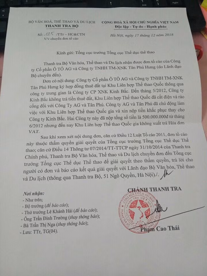 Vào ngày 17.12.2018, Thanh tra Bộ VHTTDL đã có công văn do Chánh thanh tra Phạm Cao Thái ký gửi Tổng cục TDTT thông báo đã nhận được đơn tố cáo của 2 doanh nghiệp gồm Công ty Cổ phần Ôtô AG và Công ty TNHH Tân Phú Hưng với nội dung liên quan đến việc Khu LHTTQG Mỹ Đình thu tiền của doanh nghiệp thuê đất nhưng không xuất hoá đơn VAT.