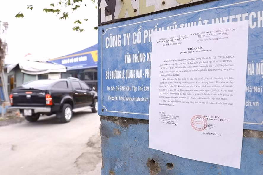 Văn bản về về tháo dỡ của Khu LHTTQG Mỹ Đình được dán ngay tại địa bàn yêu cầu di dời. Ảnh: Như Ý