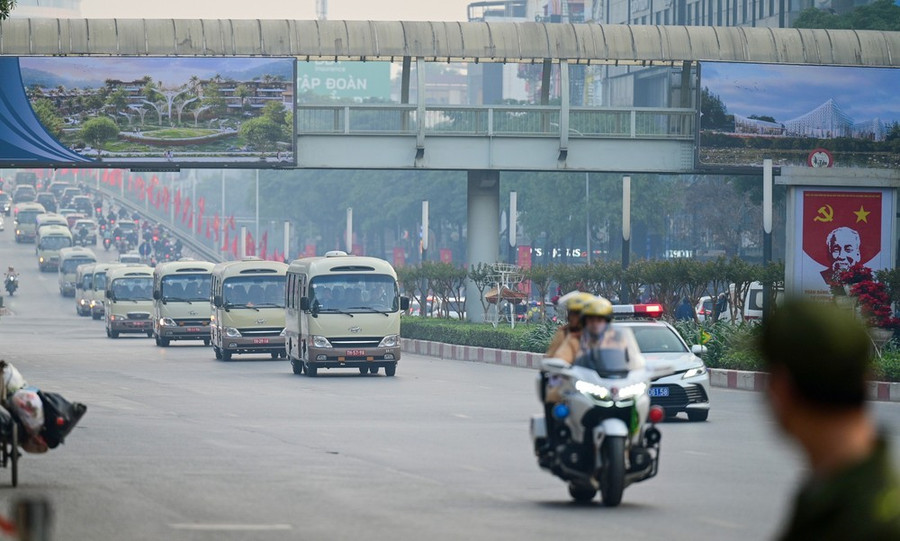 Từ 7 giờ đến 7 giờ 30, từng đoàn xe của lực lượng cảnh sát giao thông bắt đầu mở đường, dẫn đoàn xe đưa đón đại biểu di chuyển về Trung tâm Hội nghị quốc gia.