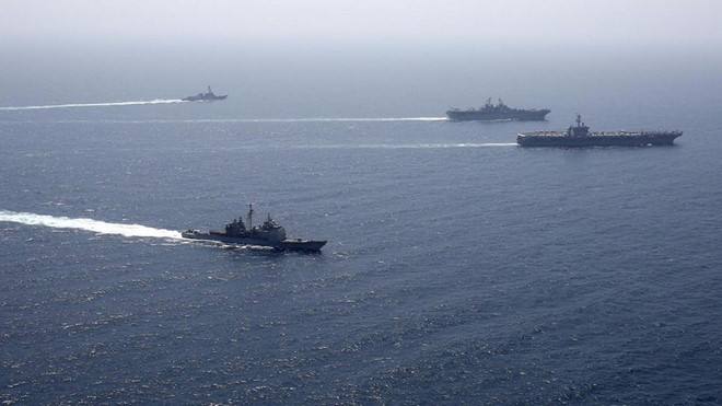 Nhóm tác chiến tàu sân bay USS Abraham Lincoln diễn tập trên Biển Ả Rập. Ảnh: HẢI QUÂN MỸ