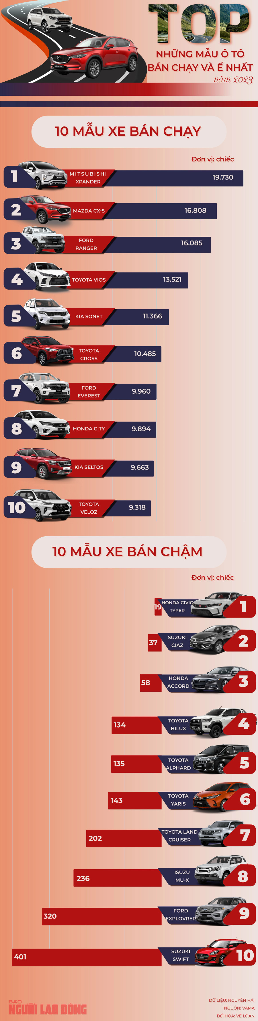 Trong khi đó, trong năm 2023, có nhiều mẫu ô tô chỉ tiêu thụ ì ạch được vài chục chiếc. Chẳng hạn, mẫu Suzuki Ciaz có 37 chiếc được bán ra, mẫu Honda Accord tiêu thụ được 58 chiếc, Honda Civic TypeR bán được 19 chiếc.