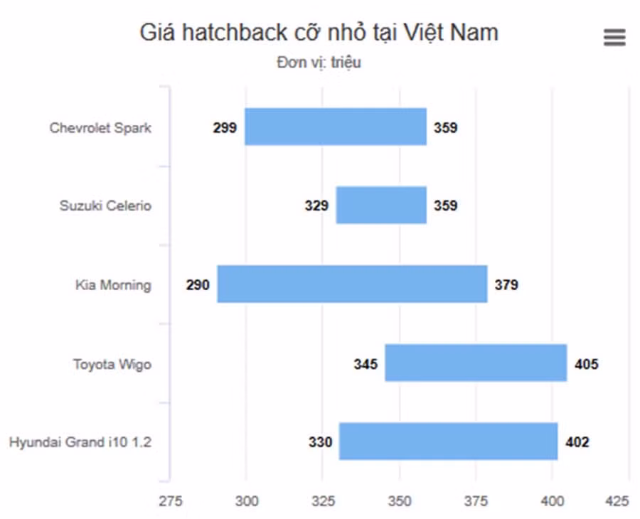 Toyota Wigo có giá 345 triệu cho bản số sàn và 405 triệu cho bản số tự động. Trong khi đó, đối thủ Hyundai Grand i10 bản động cơ 1.2 có giá tương ứng lần lượt 330 triệu và 402 triệu. Ngoài ra, mẫu hatchback Hàn Quốc còn có tùy chọn bản động cơ 1.0, với giá khởi điểm 315 triệu.