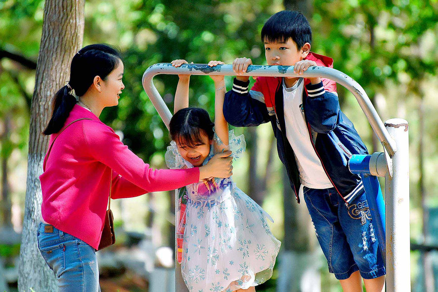 Các gia đình cho em nhỏ tham gia các trò chơi tại các điểm công cộng.
