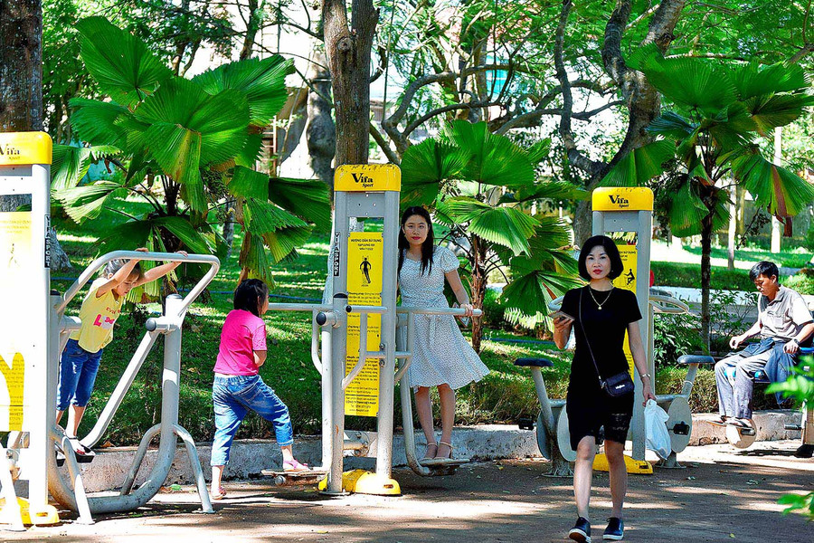 Người dân tản bộ bên bờ hồ hoặc tham gia các hoạt động ngoài trời cùng gia đình.