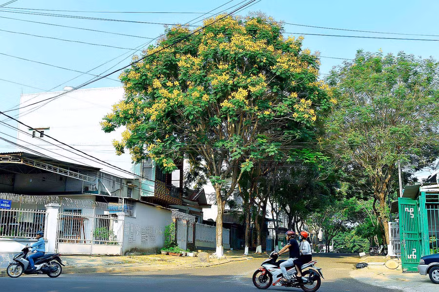 Sắc vàng rực rở của hoa Huỳnh Anh ở góc đường Nguyễn Tất Thành-Lê Lợi, hoa tô điểm cho đường phố mùa hạ thêm lộng lẫy và  thơ mộng.
