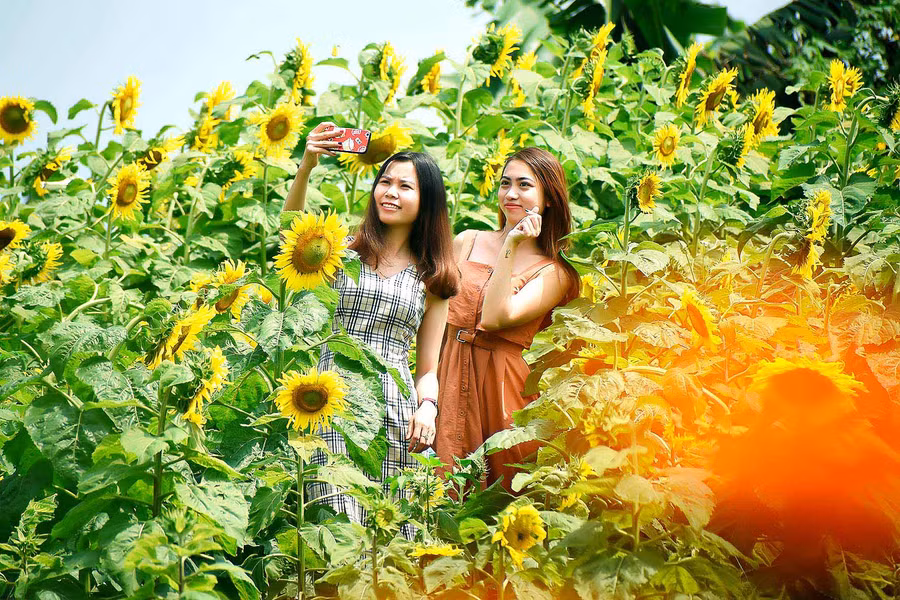 Chị Bùi Thị Kiều Diễm ở đường Tô Vĩnh Diện. TP..Pleiku tranh thủ những ngày nắng đẹp để chụp ảnh lưu niệm tại Cánh đồng hơn 20.000 cây hoa hướng dương.