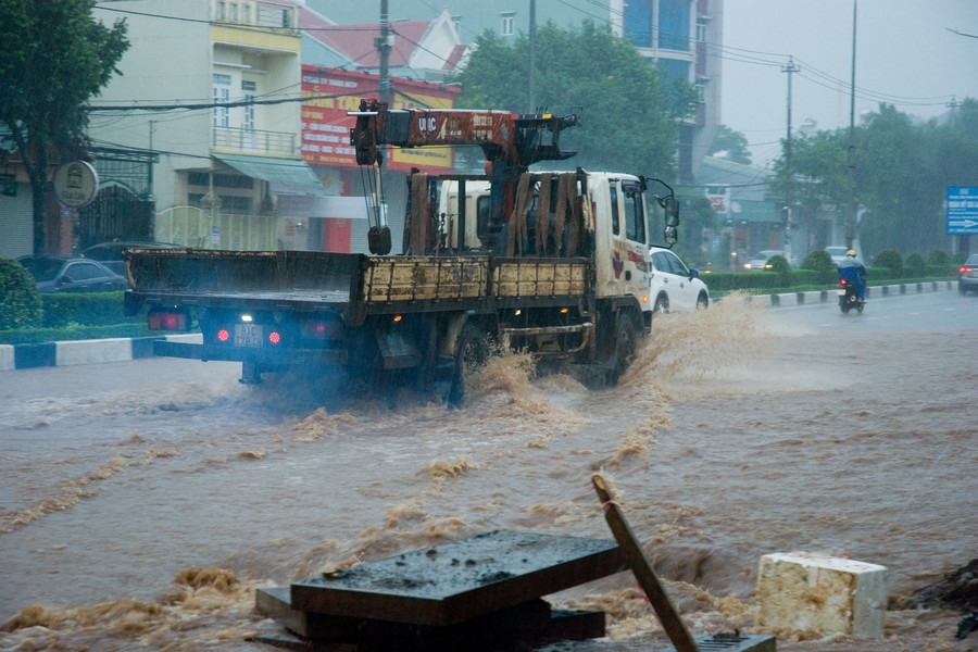 | Mưa lớn, lượng nước đổ dồn quá lớn không kịp thoát đã gây ngập mặt đường khiến các phương tiện tham gia giao thông hết sức khó khăn trên đường Phạm Văn Đồng. Ảnh: Huy Tịnh |
