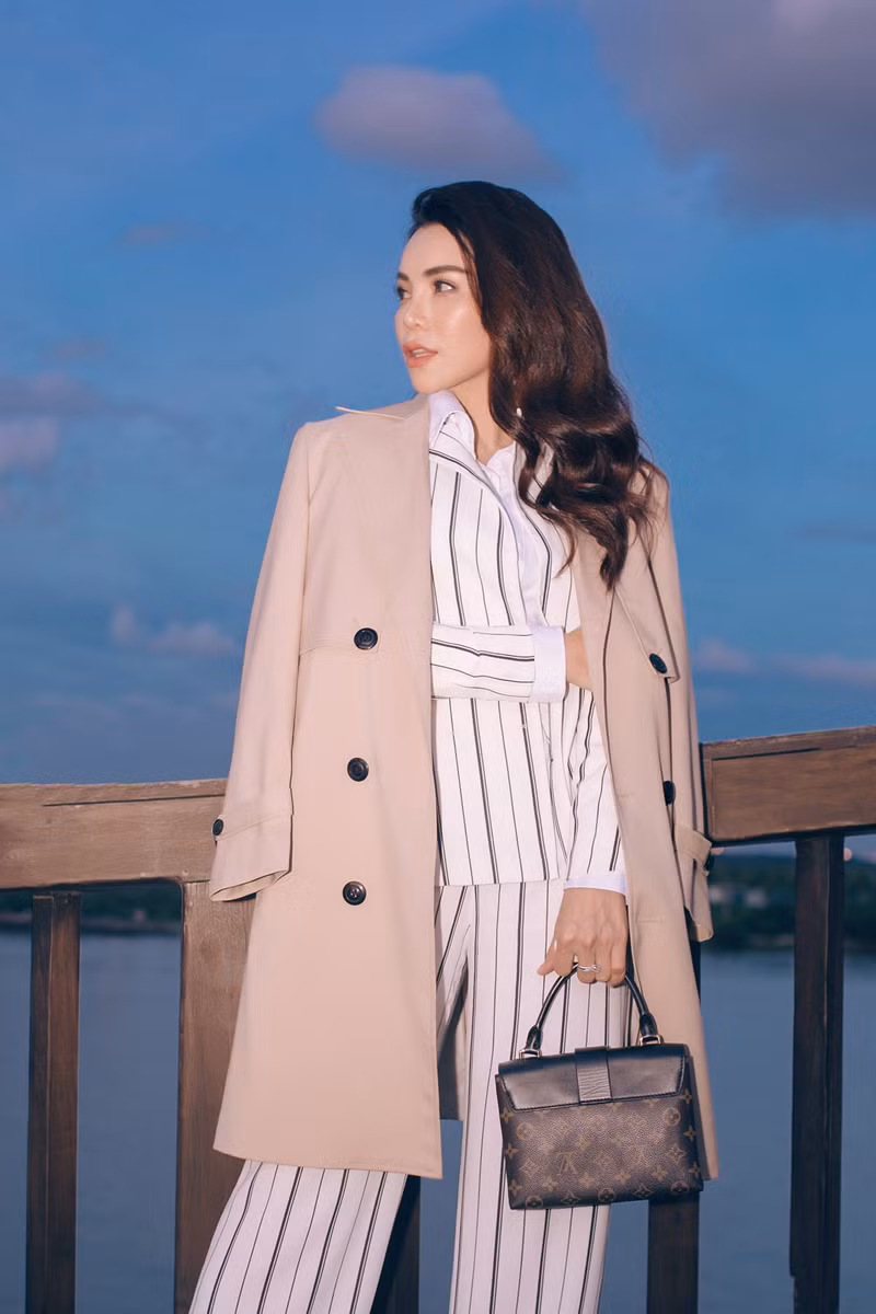 | Trà Ngọc Hằng diện bộ suit màu trắng sọc đen thanh lịch, thời thượng với áo khoác màu nude ngoài. |