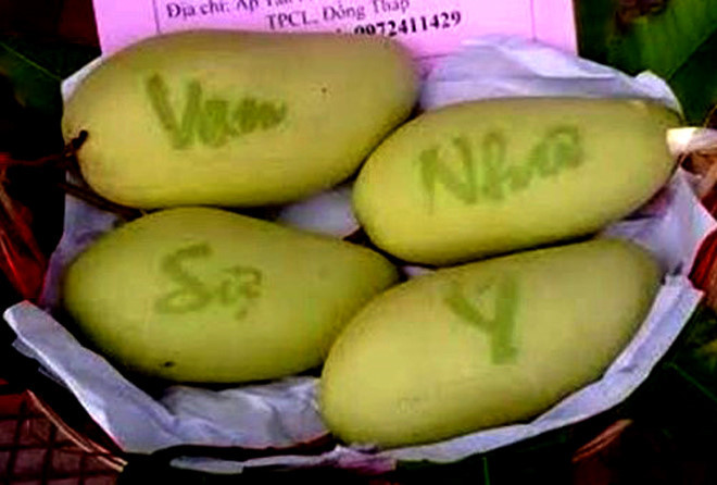 Những trái xoài được khắc chữ “vạn sự như ý” được nông dân Đồng Tháp bán ra dịp Tết Nguyên đán này, với giá khoảng 300.000 đồng/kg. Trái xoài xuất hiện trong mâm ngũ quả ở miền Nam với ý nghĩa cầu mong cho việc tiêu xài không thiếu thốn.