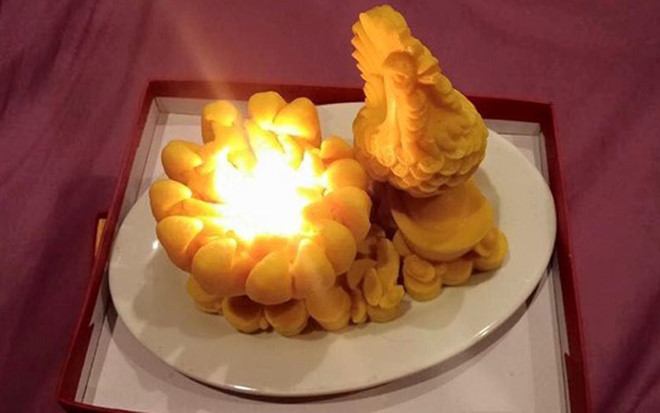 Nến phật thủ kim kê cũng là một sản phẩm đẹp mắt mới lạ xuất hiện bên mâm mũ quả trên bàn thờ gia tiên dịp Tết Đinh Dậu.