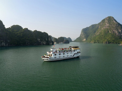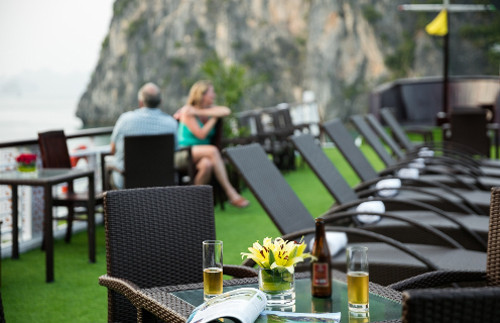 Du khách có thể ngồi trên sundeck của du thuyền và nhâm nhi một ly rượu vang hay cocktail để ngắm nhìn toàn cảnh vịnh Hạ Long nên thơ, trong lành.