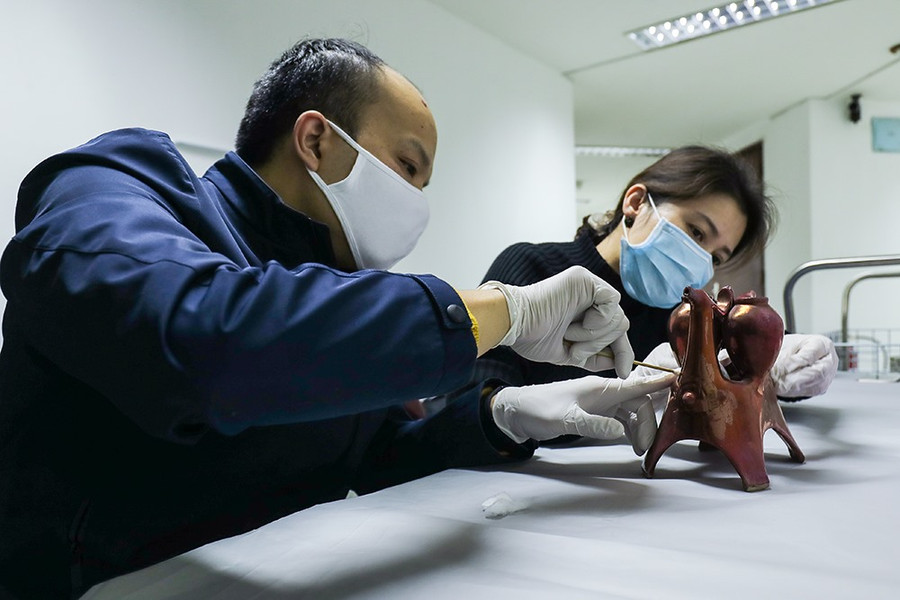 | Các cán bộ lưu trữ bảo quản hiện vật tại kho lưu trữ hiện vật của Bảo tàng Hồ Chí Minh. Ảnh: SƠN TÙNG |
