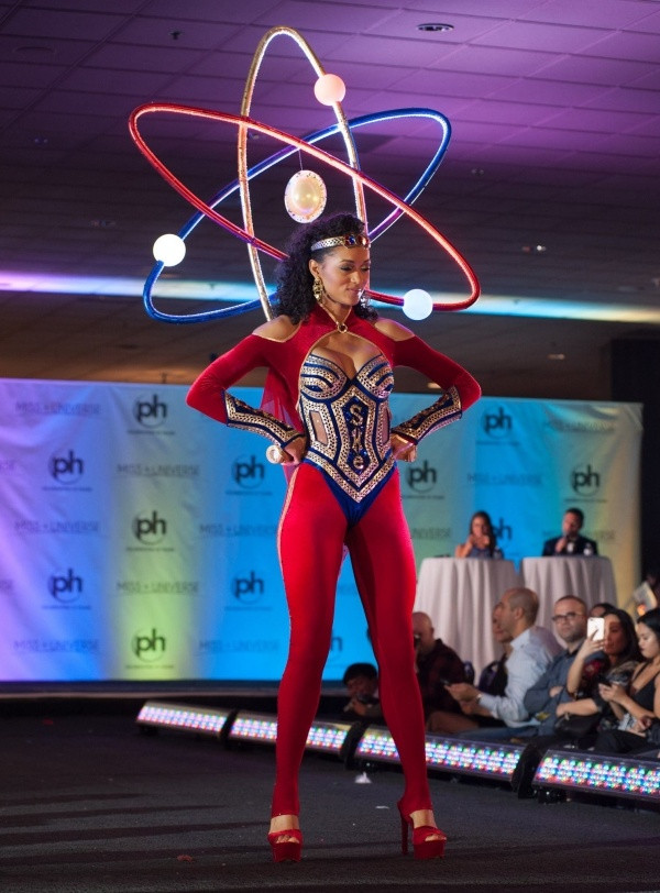 93 người đẹp trình diễn trang phục dân tộc trên sân khấu Planet Hollywood Resort & Casino ở Mỹ. Đại diện Nam Phi Demi-Leigh Nel-Peters (trái) và Rachel Peters - Miss Philippines (phải) - nằm trong số những thí sinh có trang phục dân tộc gợi cảm nhất cuộc thi.