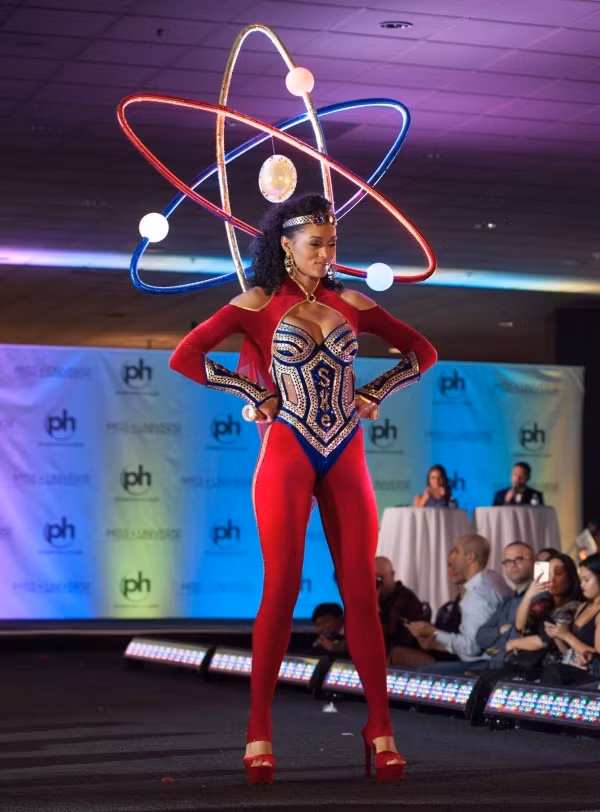 Đại diện Mỹ - Kára McCullough - diện bộ bodysuit mang tông màu đỏ và xanh đặc trưng trên lá cờ quê hương.