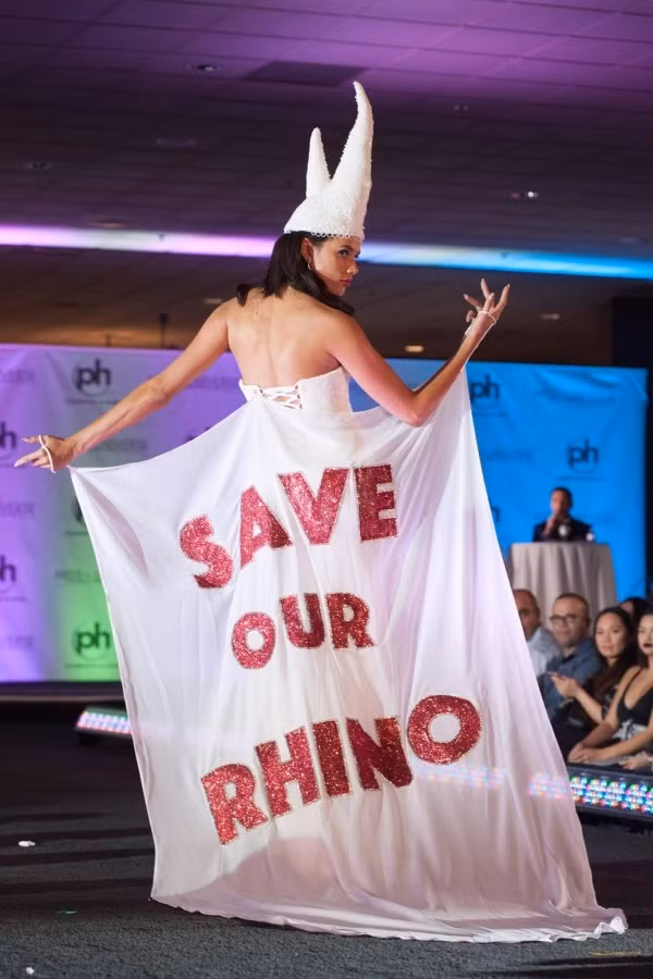 Suné January - đại diện Namibia - với trang phục mang thông điệp cứu tê giác.