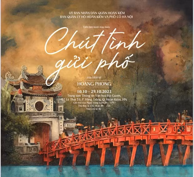 Triển lãm mang đến 54 bức tranh khắc họa cảnh quan đô thị Hà Nội của Hoàng Phong, kéo dài từ ngày 10 đến 29/10 tại Trung tâm Thông tin Văn hóa Hồ Gươm (số 2 Lê Thái Tổ, quận Hoàn Kiếm, Hà Nội).