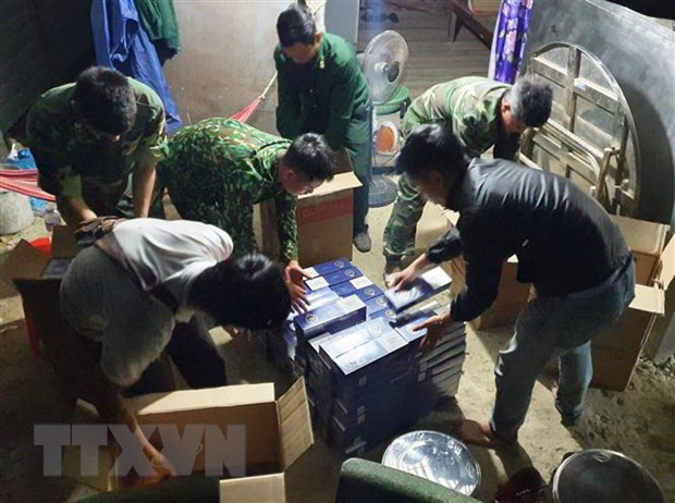 Các chiến sỹ Đồn biên phòng Cửa khẩu Quốc tế Mộc Bài kiểm điếm số thuốc điếu lá ngoại nhập lậu bị bắt giữ. (Ảnh minh họa: Thanh Tân/TTXVN)