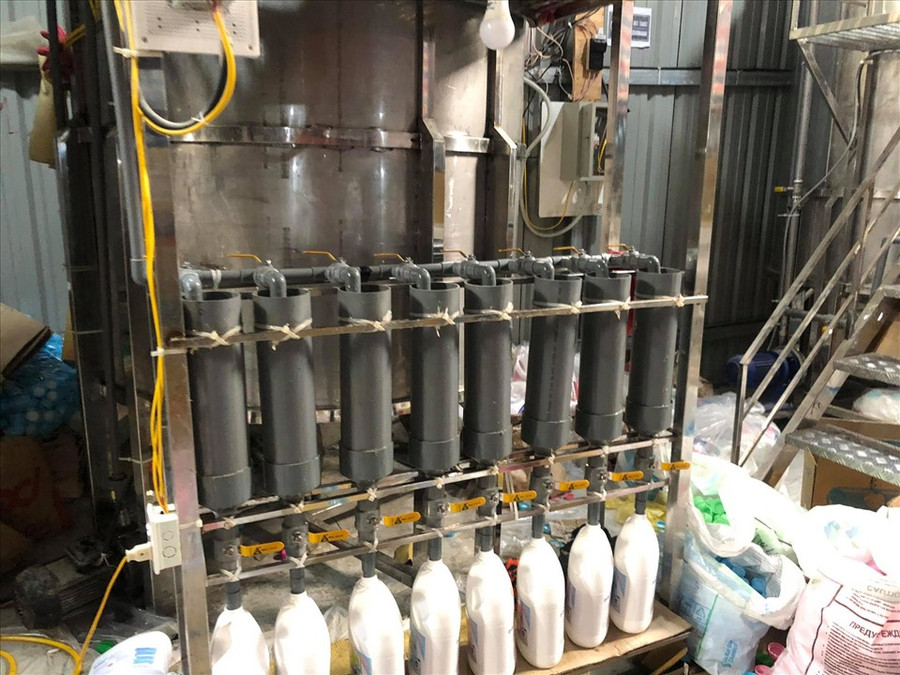 | Máy móc thiết bị làm nước giặt giả mạo. Ảnh: C.N |