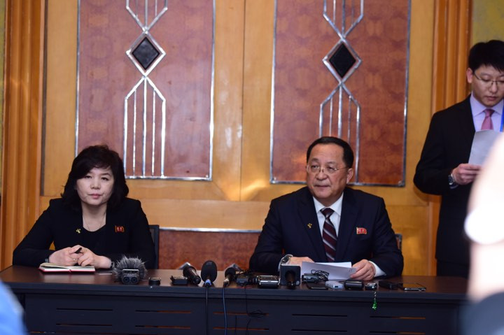 Ngoại trưởng Ri Yong Ho (phải) đọc bản tuyên bố đã chuẩn bị sẵn. (Ảnh: G.H)