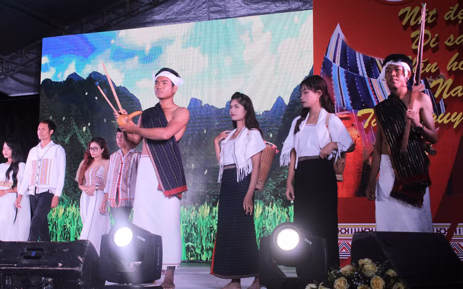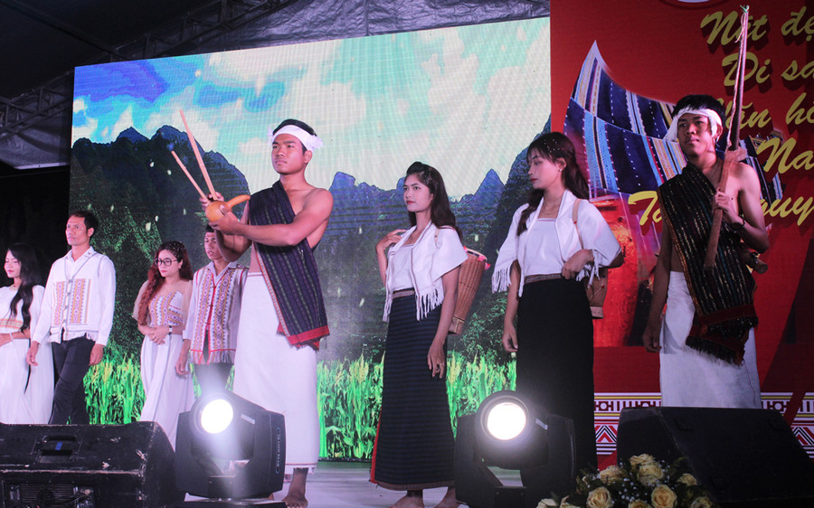 Trang phục hàng ngày, trang phục trong lao động sản xuất cùng những bước chân trần mô phỏng động tác săn bắn, hái lượm, lấy nước, tỉa hạt kèm theo các dụng cụ phụ trang như gùi, rìu, ná, lao, nơm, giỏ như tái hiện sống động đời sống vật chất của cộng đồng các dân tộcthiểu số tại địa phương.