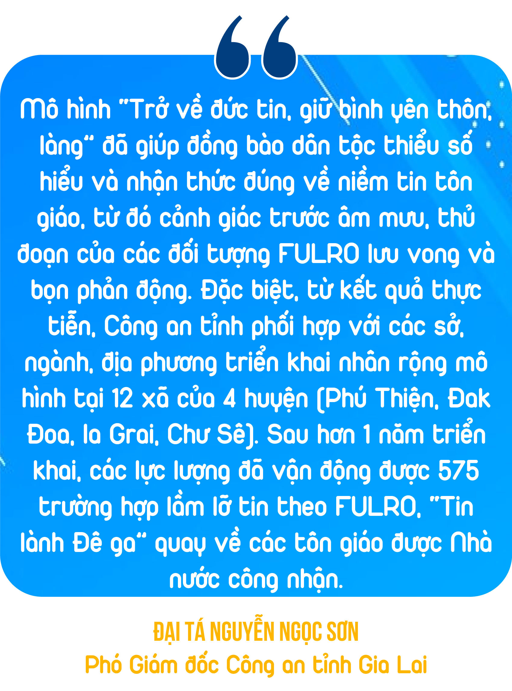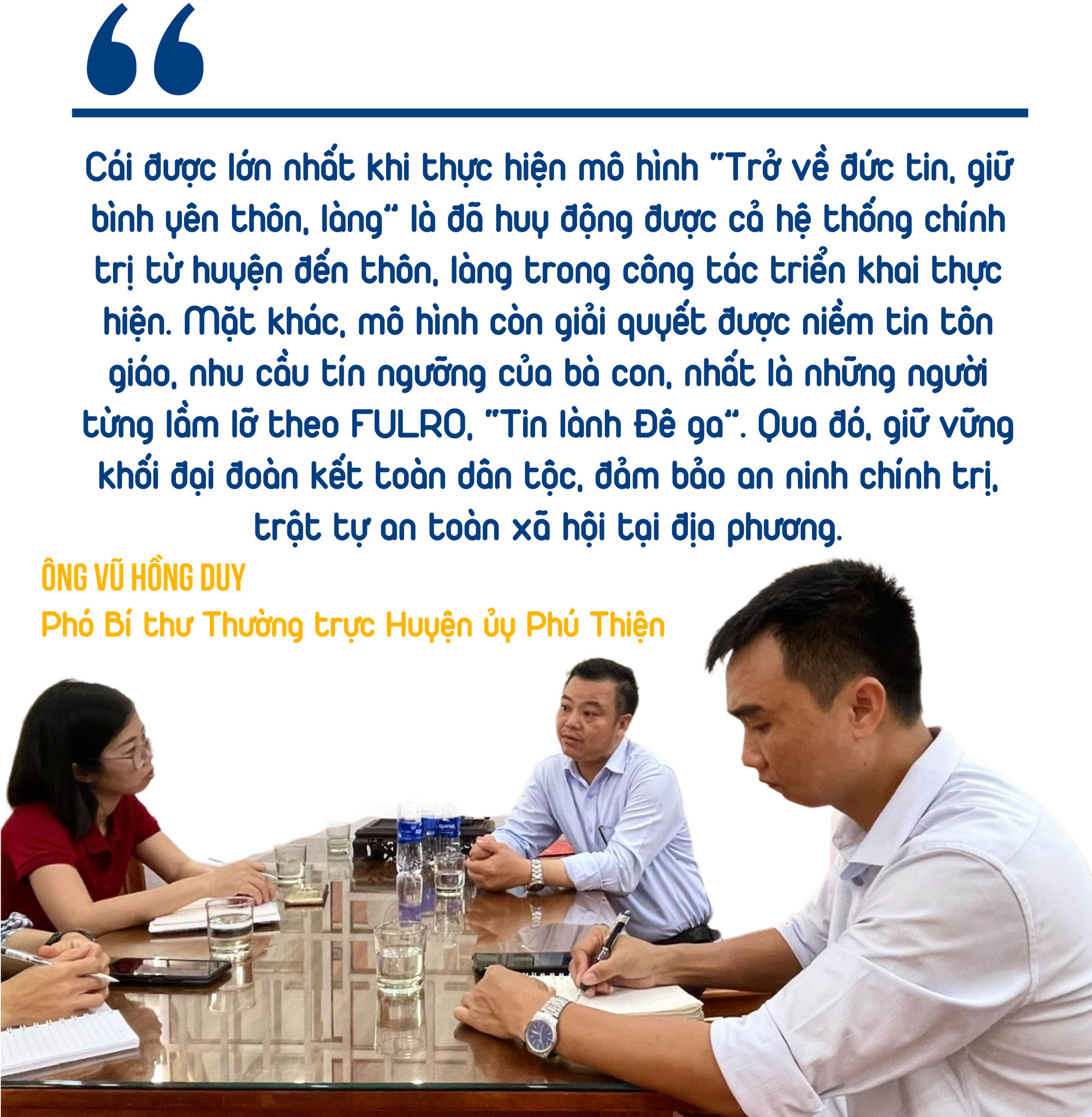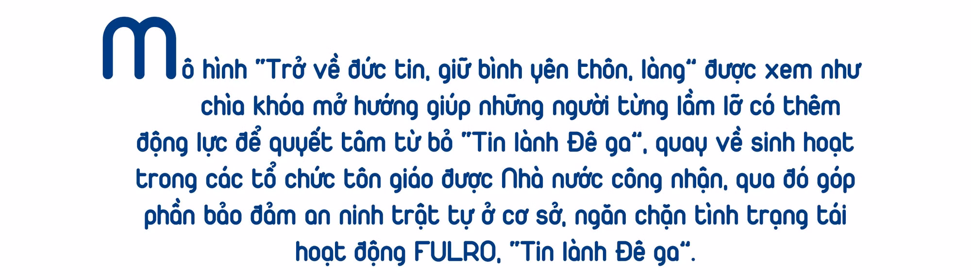 Ông Vũ Hồng Duy-Phó Bí thư Thường trực Huyện ủy Phú Thiện-cho biết: Trước khi triển khai mô hình, địa phương có 312 hộ (1.299 khẩu) tham gia hoạt động FULRO, “Tin lành Đê ga”. Đến nay, huyện đã vận động được 114 hộ (499 khẩu) tự nguyện quay về sinh hoạt tôn giáo hợp pháp. Đáng chú ý, việc các đối tượng tự nguyện từ bỏ “Tin lành Đê ga” đã góp phần xóa bỏ tư tưởng chống đối, âm mưu, ý đồ tái hoạt động FULRO, giúp địa phương đẩy mạnh công tác đấu tranh, ngăn chặn, đẩy lùi các hoạt động chống phá Đảng, Nhà nước của các thế lực phản động.