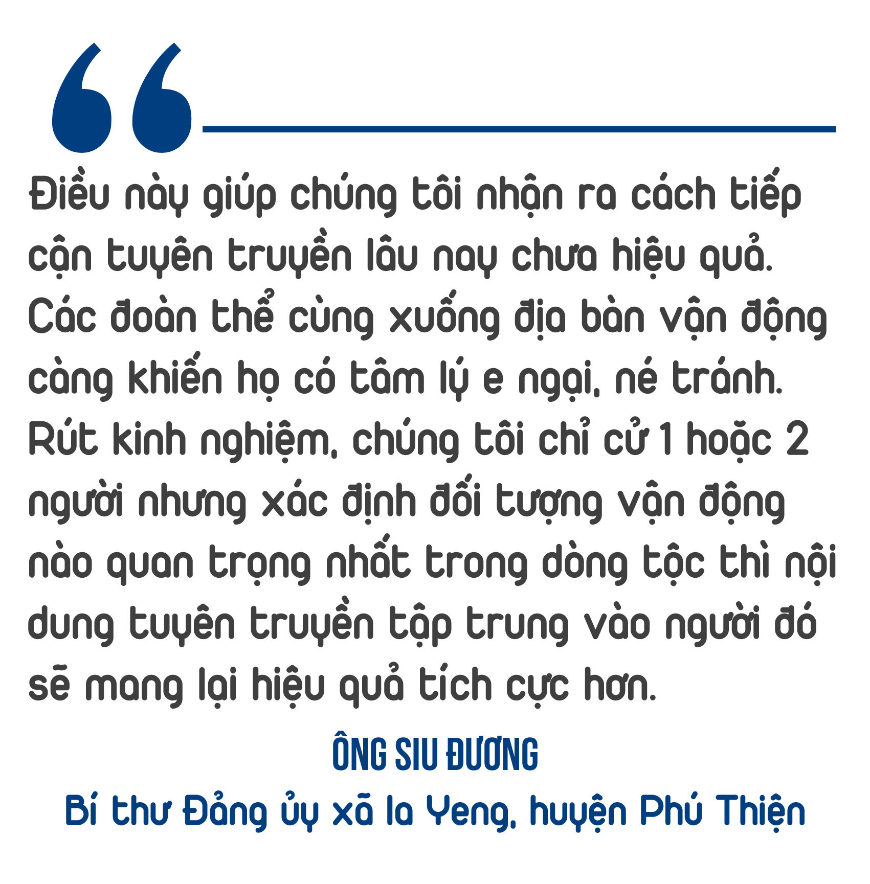 Cũng theo ông Đương, vấn đề quan trọng là thành viên tổ công tác và đối tượng tuyên truyền phải phù hợp lứa tuổi thì mới có thể gần gũi, chia sẻ theo kiểu “mưa dầm thấm lâu”, từ câu chuyện bên bếp lửa cho đến việc nương rẫy rồi mới từng bước tác động tư tưởng, nhận thức, tiến tới giúp họ xóa bỏ mặc cảm, tự ti.