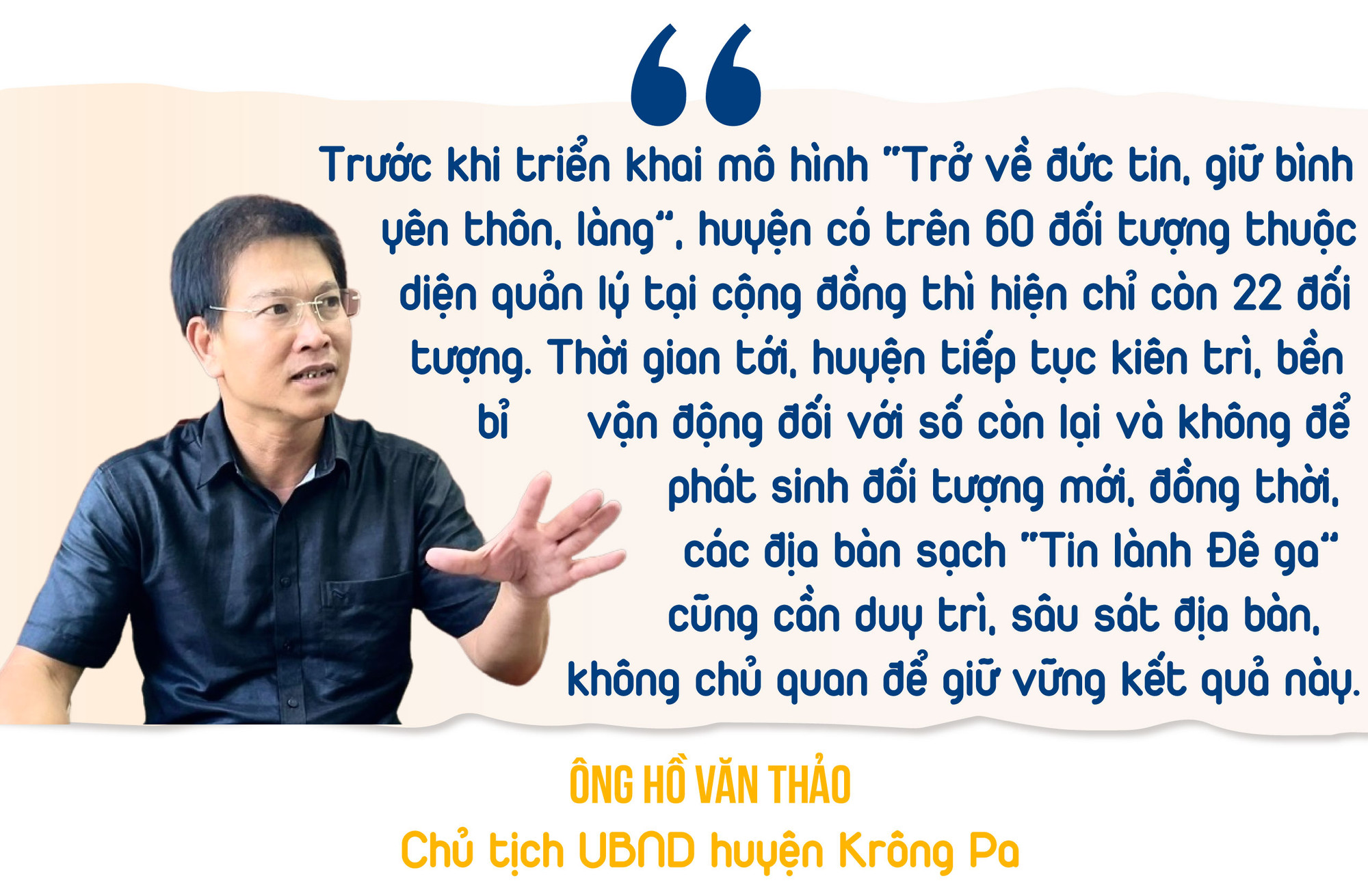 Ông Thảo nêu minh chứng cụ thể: Một đối tượng lầm lỡ bị cháy nhà, mất hết tài sản, huyện đứng ra vận động kinh phí, xã hỗ trợ vật liệu, người dân ủng hộ ngày công xây nhà. Chúng tôi luôn coi những người lầm lỡ trở về như những công dân bình thường, đối xử công bằng, khách quan. Chính vì thế, họ sẽ tự thấy được chính quyền, cộng đồng không phân biệt đối xử, kỳ thị và nhận ra ai hỗ trợ, giúp đỡ mình, ai hứa suông. Từ đó, không những họ tự nguyện từ bỏ “Tin lành Đê ga” mà còn vận động người thân, họ hàng và các đối tượng khác không tiếp tục hành vi sai trái.
