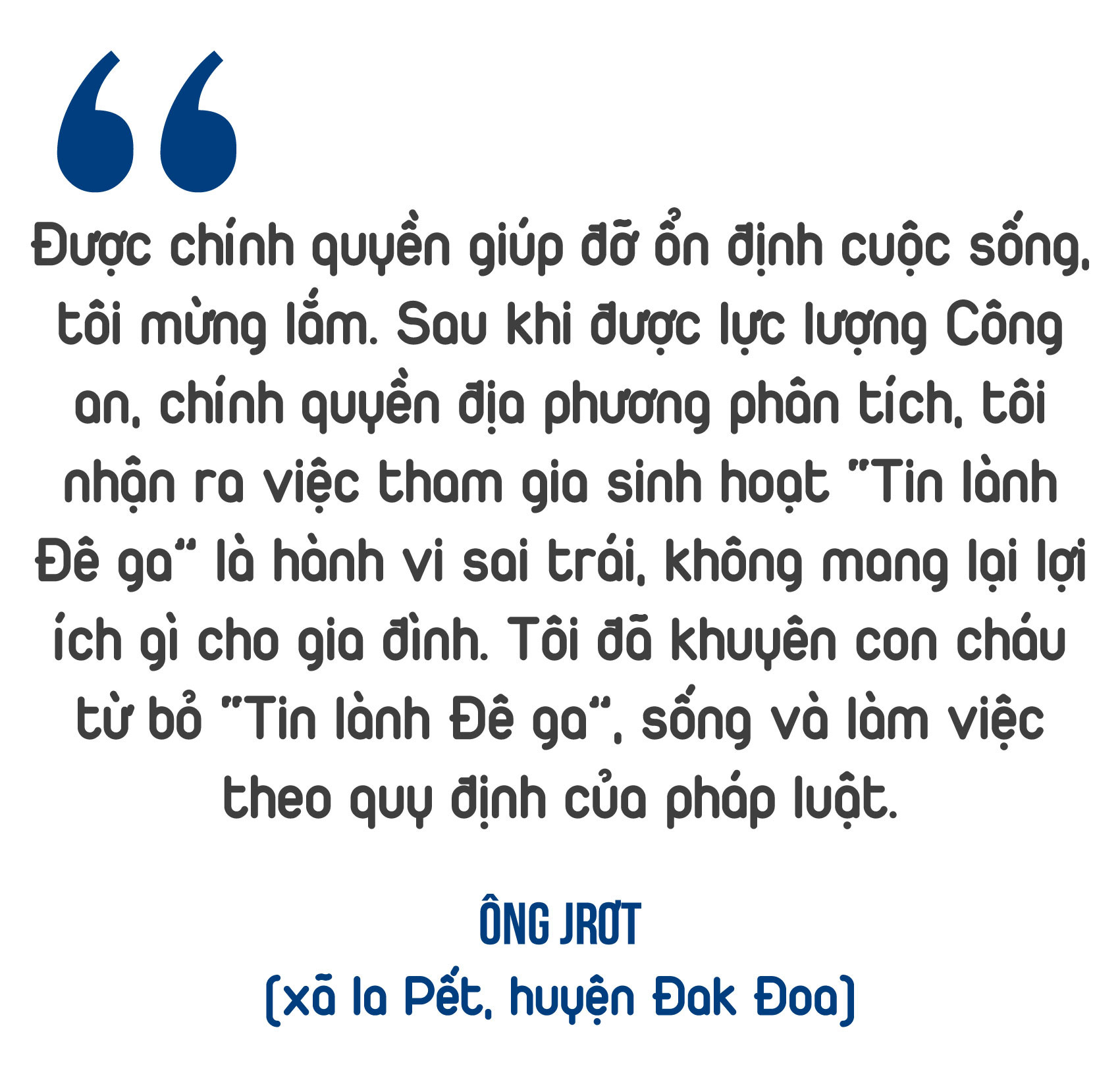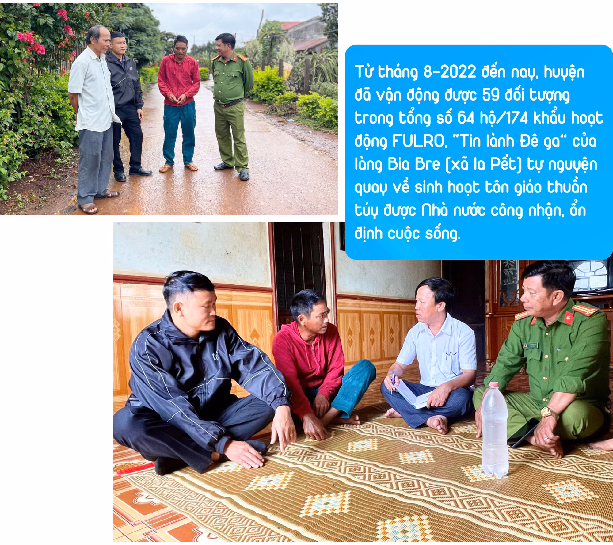 Đơn cử, gia đình ông Jrơt (làng Bia Bre) trước đây theo “Tin lành Đê ga”. Bị FULRO xúi giục nên ông từng có ý định đưa cả gia đình vượt biên sang Thái Lan. Nhờ chính quyền kịp thời phát hiện, thuyết phục, ông đã từ bỏ ý định này. Thấu hiểu hoàn cảnh khó khăn của gia đình, chính quyền địa phương đã hỗ trợ một phần kinh phí để xây dựng nhà mới.