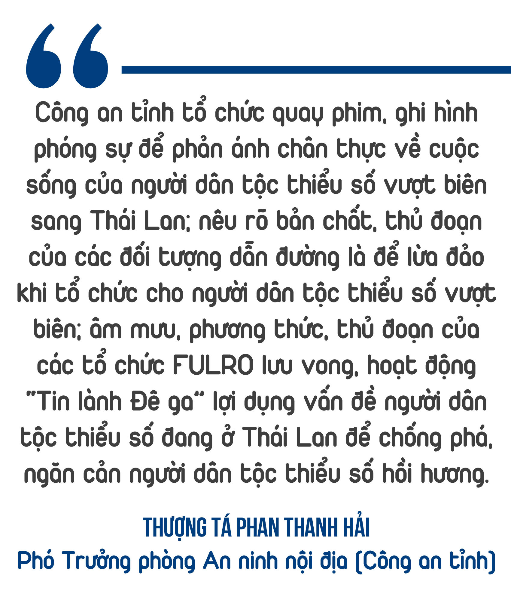 Để ngăn ngừa tình trạng các đối tượng FULRO lưu vong lừa phỉnh, lôi kéo, dụ dỗ người dân tộc thiểu số vượt biên, Công an tỉnh đã tổ chức tiếp xúc, vận động hơn 100 lượt người có uy tín trong vùng đồng bào dân tộc thiểu số tại các địa bàn trọng điểm tích cực tuyên truyền, vận động quần chúng không nghe theo luận điệu tuyên truyền, kích động của các đối tượng, không vượt biên. Thượng tá Phan Thanh Hải-Phó Trưởng phòng An ninh nội địa (Công an tỉnh) cho biết: