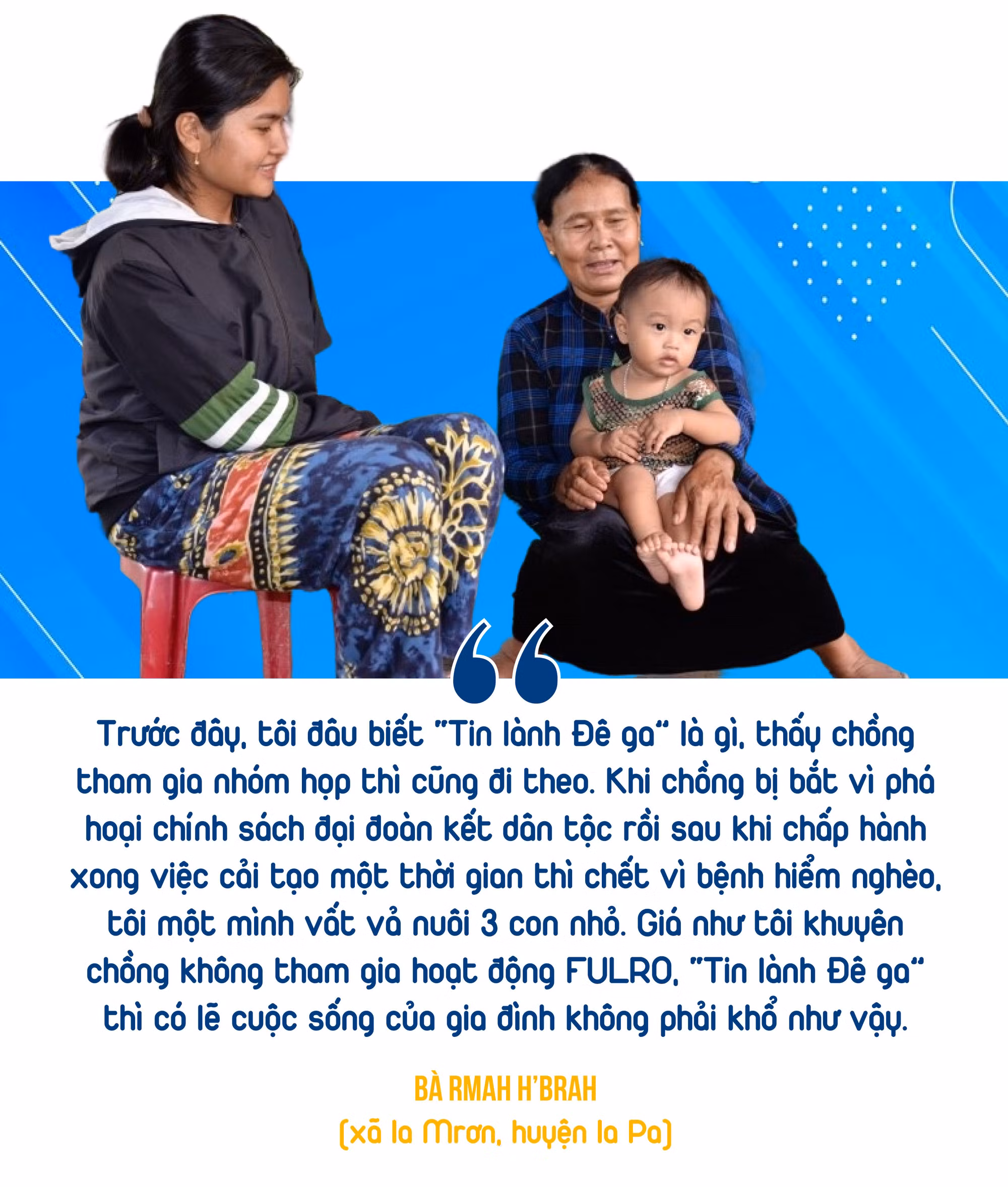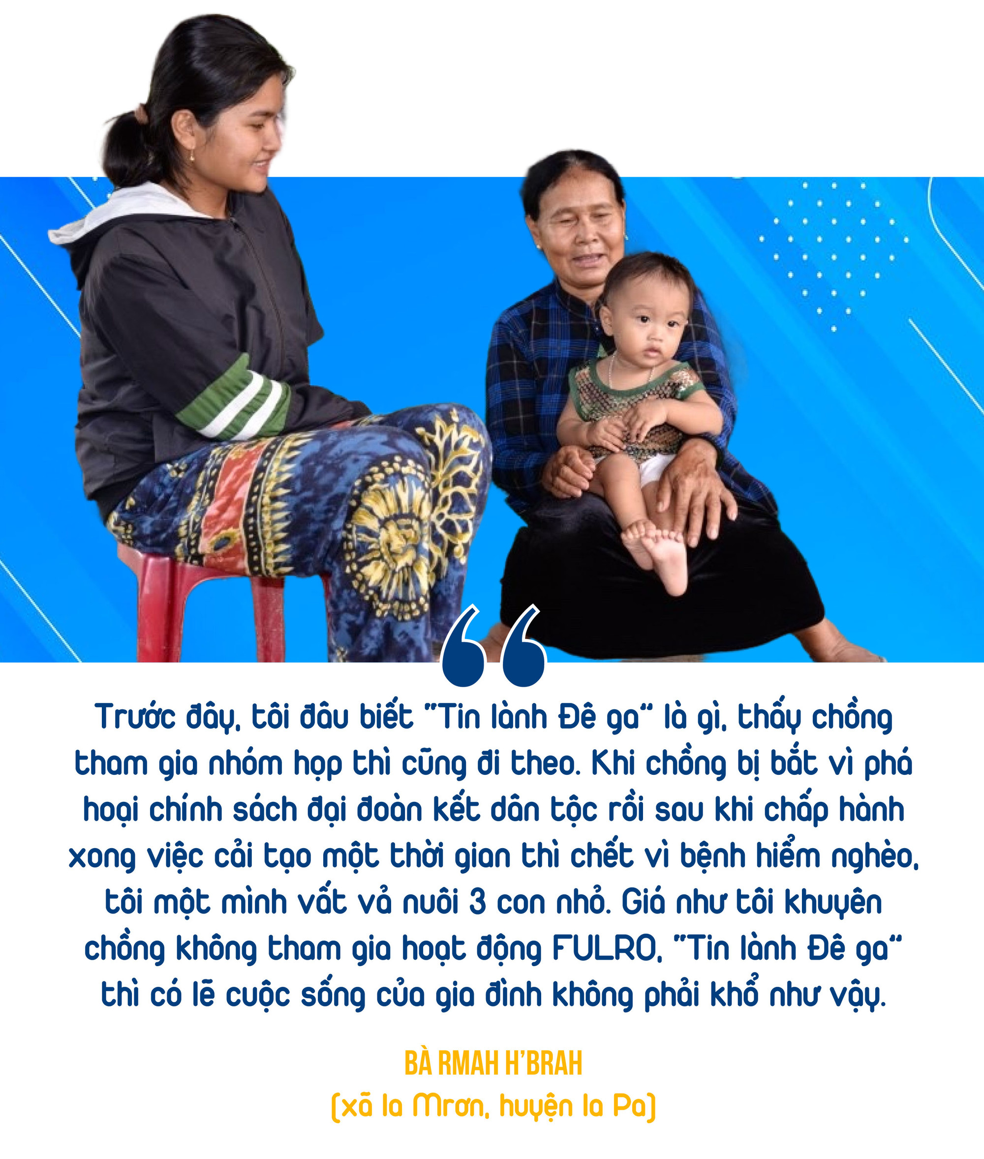 “Từng lầm đường lạc lối tham gia hoạt động FULRO, “Tin lành Đê ga” nên tôi nói với người thân, họ hàng và bà con còn theo “Tin lành Đê ga” thì hãy bỏ hết đi, không có ích lợi gì hết. Tôi cũng giải thích cho họ rằng theo người xấu có thể làm cho mình mất nhà cửa, gia đình không được yên ổn, cuộc sống ngày càng thêm khó khăn, thiếu thốn”-bà H’Brah phân tích.
