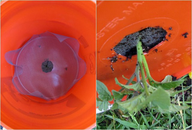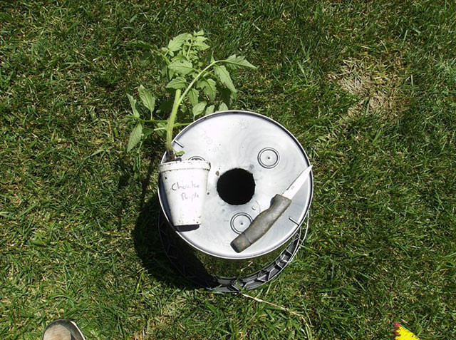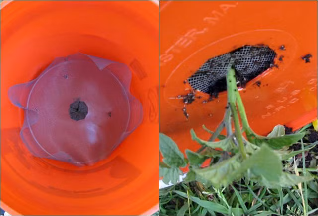Bước 6: Lót lưới phía dưới đáy chậu cho đất không bị rơi ra ngoài và trồng cà chua vào. Tháo bỏ lớp ni-long buộc ở miệng thùng và tưới nước hàng ngày.