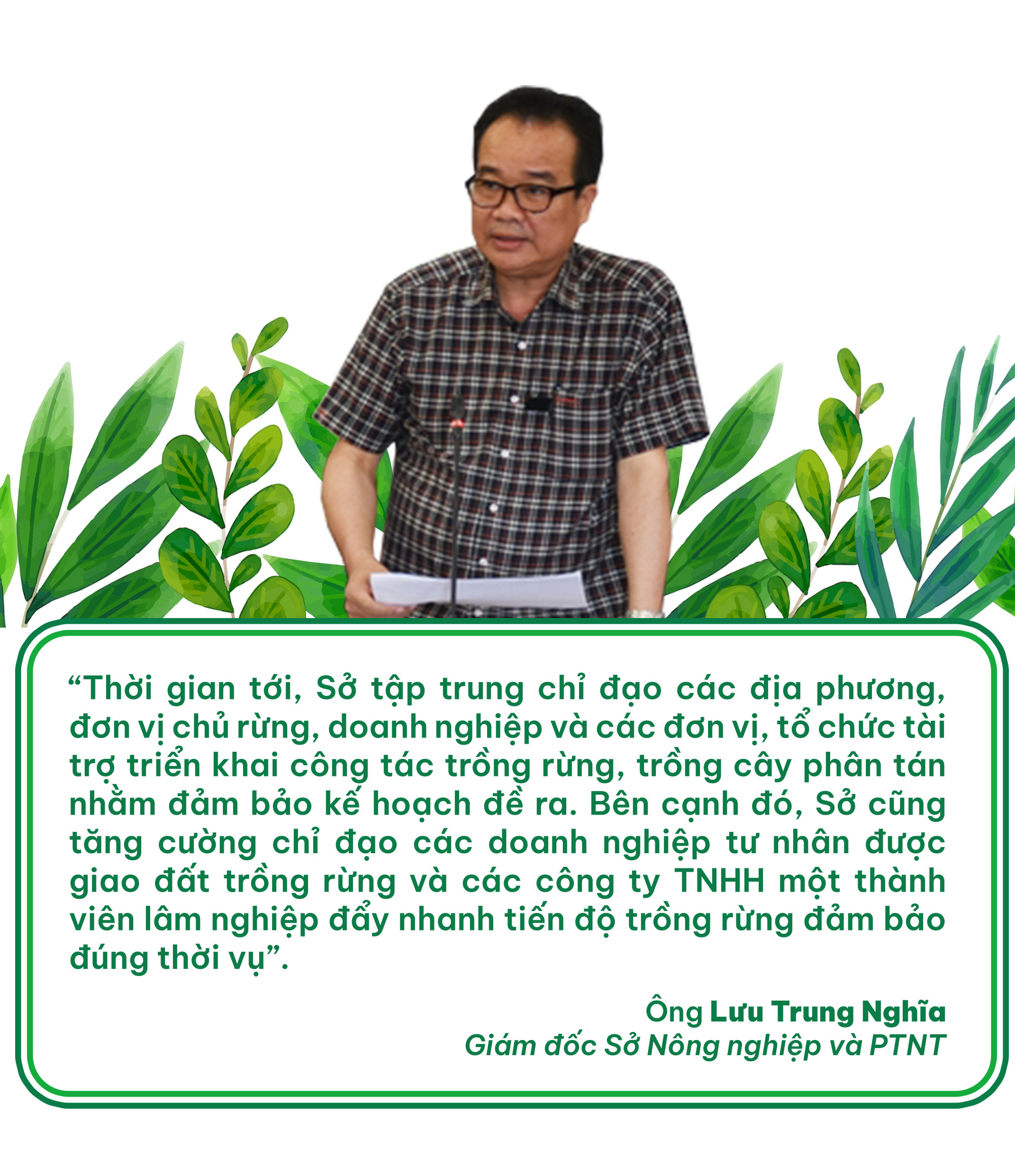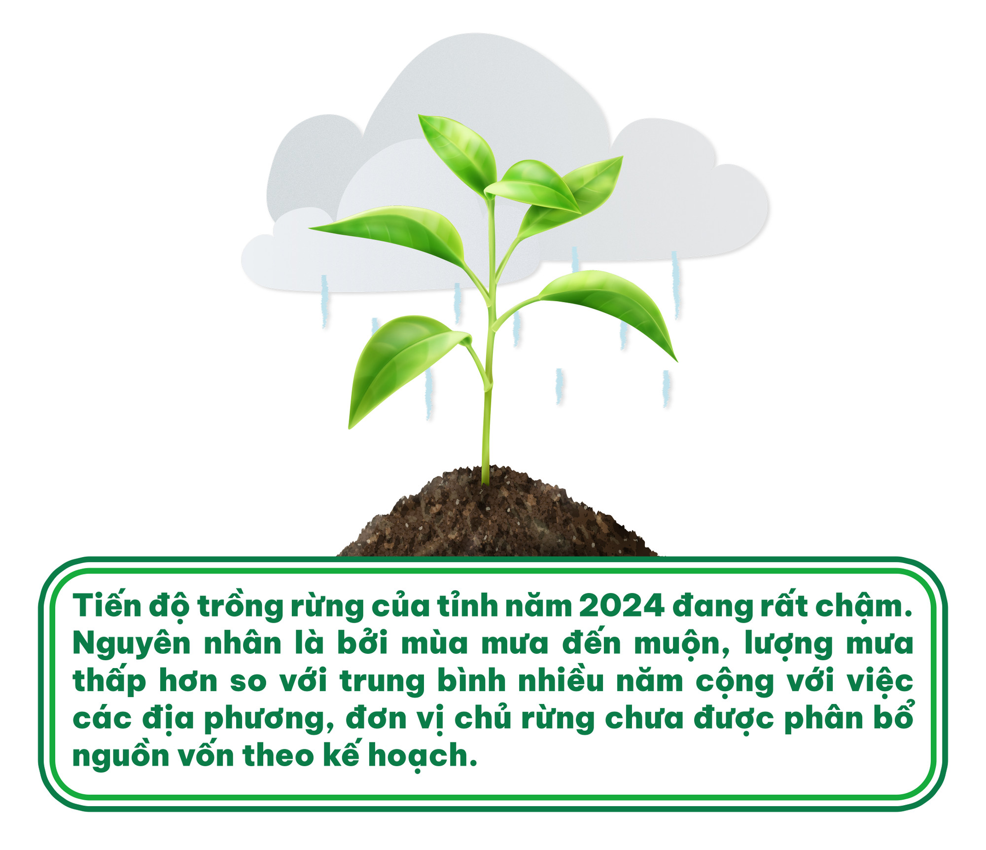 Năm 2024, toàn tỉnh phấn đấu trồng khoảng 10.300 ha rừng và cây phân tán. Trong đó, diện tích trồng rừng do các địa phương, đơn vị chủ rừng đăng ký triển khai thực hiện khoảng 4.696 ha (rừng tập trung khoảng 2.896 ha, trồng cây phân tán 1.800 ha); diện tích trồng rừng từ nguồn vốn kêu gọi đầu tư của các dự án trồng rừng sản xuất hơn 5.600 ha. Tuy nhiên, đến nay, toàn tỉnh mới trồng được hơn 360 ha rừng.