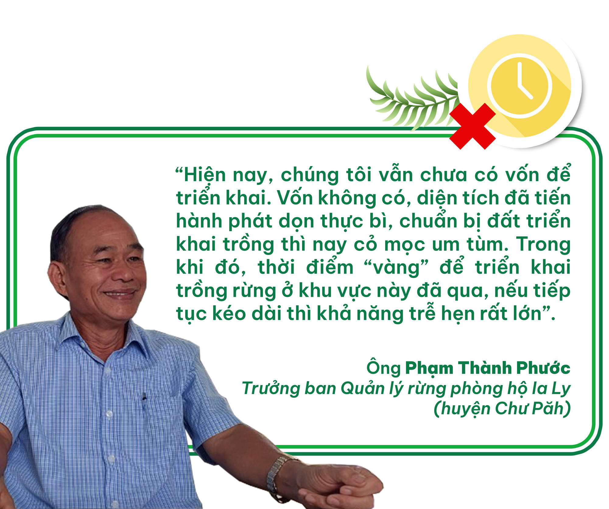Ông Phạm Thành Phước-Trưởng ban Quản lý rừng phòng hộ Ia Ly (huyện Chư Păh) cũng thông tin: Năm 2024, đơn vị được giao trồng hơn 78 ha rừng thay thế và 60 ha rừng sản xuất. Đến thời điểm này, đơn vị đã tiến hành rà soát, xác định quỹ đất để triển khai trồng rừng, đồng thời tiến hành phát dọn thực bì chuẩn bị xuống giống. Tuy nhiên, đơn vị vẫn chưa được giao vốn nên không thể tiến hành trồng rừng.