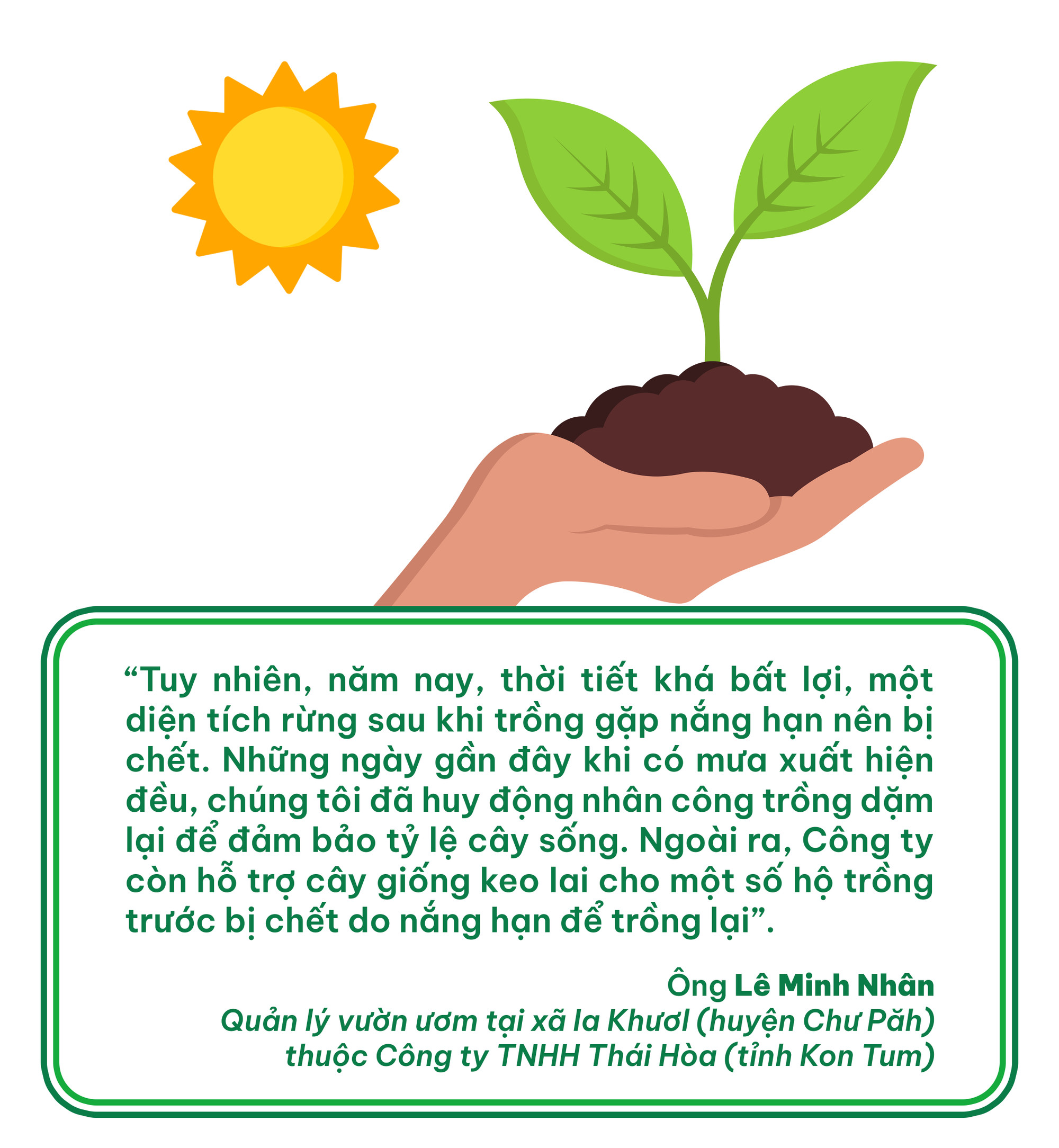 Ông Lê Minh Nhân-Quản lý vườn ươm tại xã Ia Khươl (huyện Chư Păh) thuộc Công ty TNHH Thái Hòa (tỉnh Kon Tum) cho biết: Hưởng ứng Chiến dịch trồng 1 tỷ cây xanh của Thủ tướng Chính phủ, đơn vị đã đồng hành cùng địa phương triển khai hỗ trợ cây giống cho người dân tiến hành phủ xanh đồi trọc nhằm ứng phó với biến đổi khí hậu. Năm 2023, Công ty hỗ trợ 52 ngàn cây keo và thông 3 lá cho người dân xã Ia Khươl trồng rừng, còn năm nay đã hỗ trợ trên 3.000 cây keo.