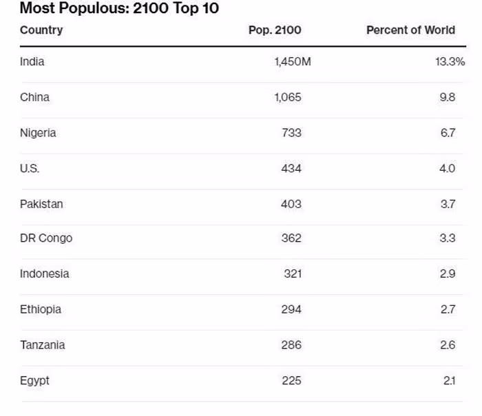 Theo Bloomberg, báo cáo Triển vọng Dân số Thế giới 2019 cho biết từ năm 2019 đến 2050, các nước Ấn Độ, Nigeria, Pakistan, Cộng hòa Dân chủ Congo, Ethiopia, Tanzania, Indonesia, Ai Cập và Mỹ là những quốc gia có tốc độ tăng dân số nhanh nhất thế giới.