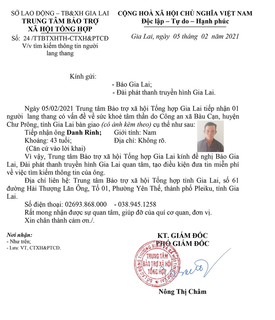 (GLO)- Ngày 5-2-2021, Trung tâm Bảo Trợ Xã hội tổng hợp tỉnh Gia Lai có Thông báo số 24/TTBTXHTH-CTXH&PTCĐ về việc tìm kiếm thông tin người lang thang.