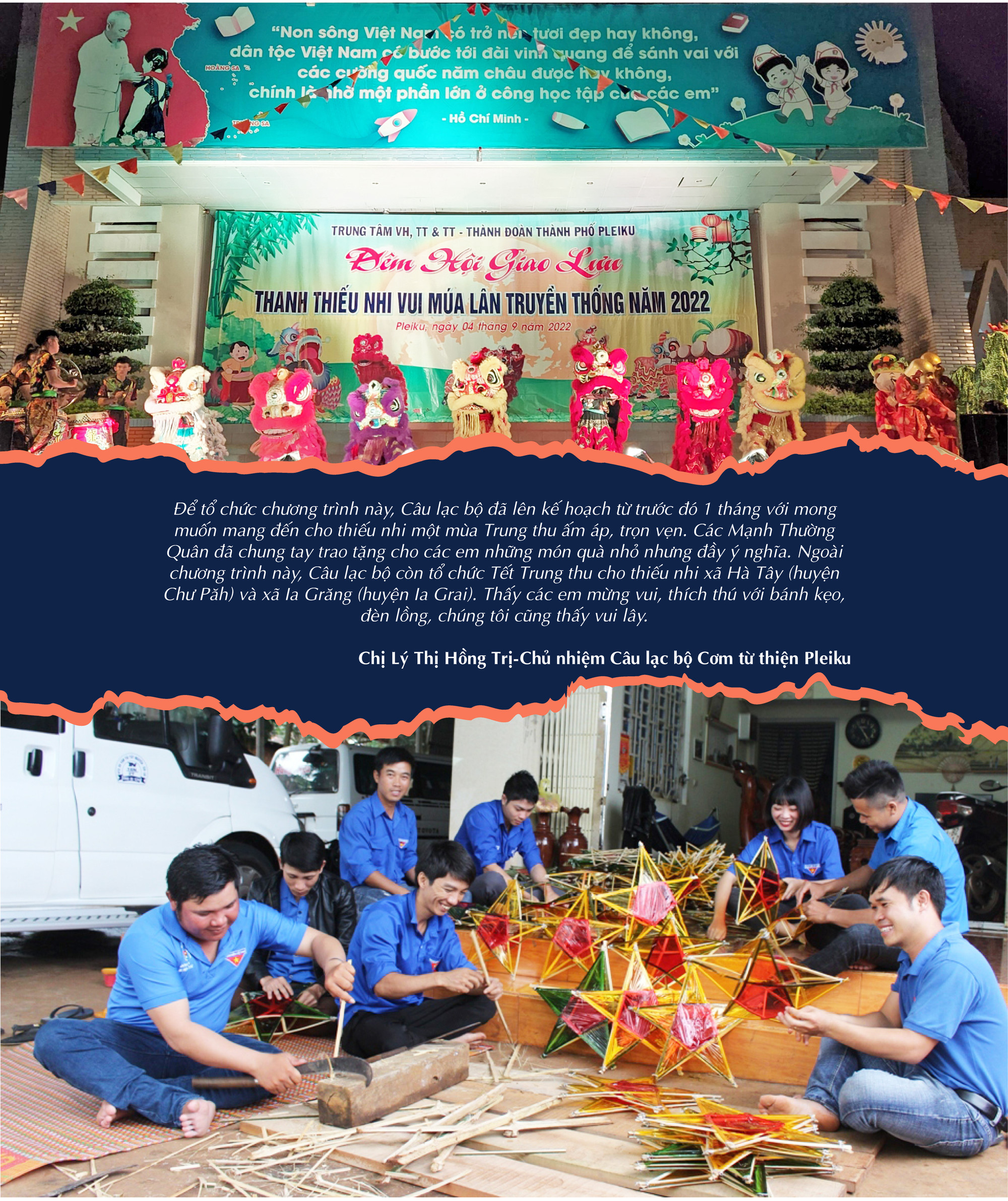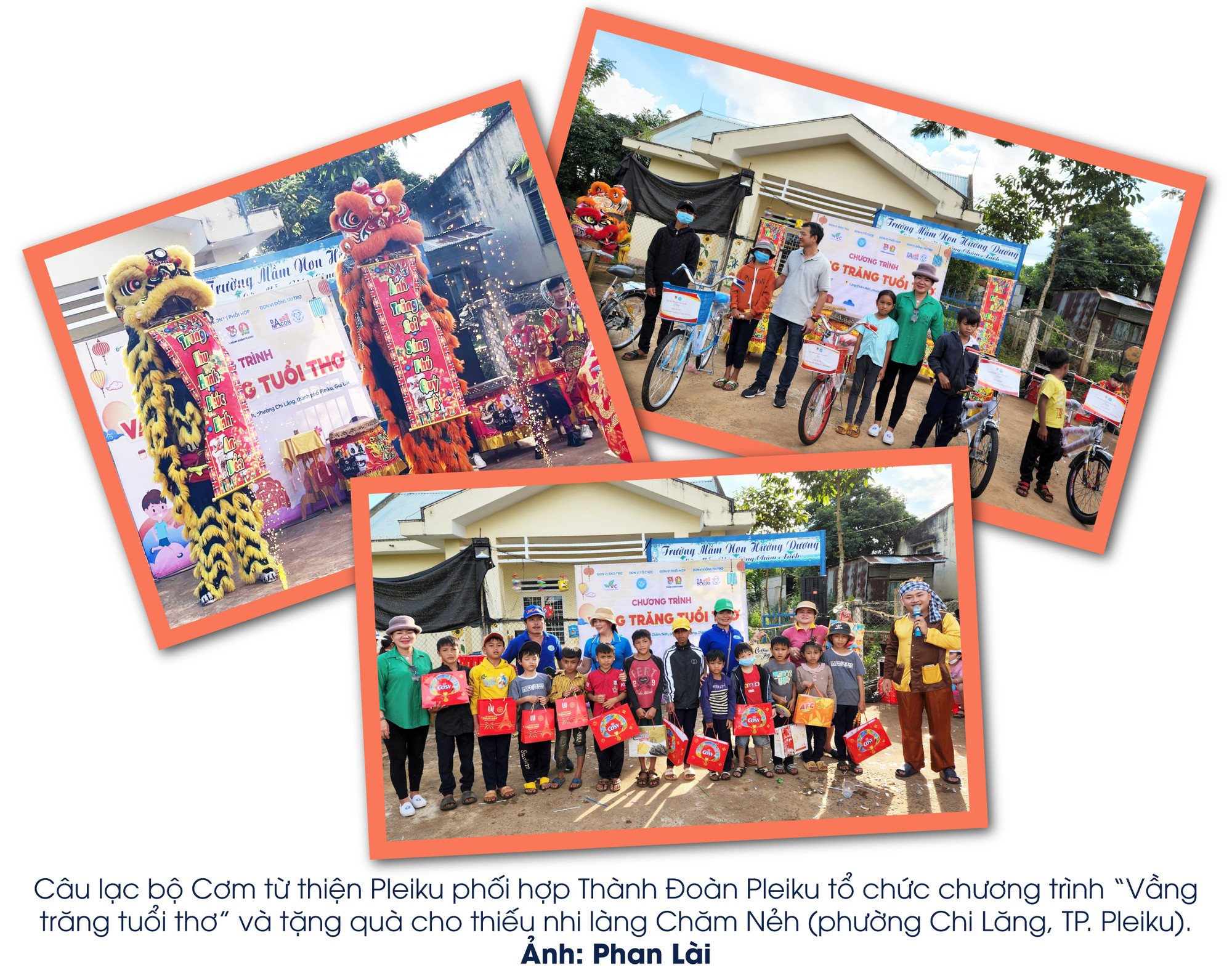 Với mong muốn mang niềm vui đến với các em thiếu nhi ở buôn làng, ngày 4-9, Câu lạc bộ Cơm từ thiện Pleiku phối hợp với Thành Đoàn Pleiku tổ chức chương trình “Vầng trăng tuổi thơ” tại làng Chăm Nẻh, phường Chi Lăng. Một sân khấu nhỏ được dựng lên tại điểm trường làng Chăm Nẻh (Trường Mầm non Hướng Dương). Trong không gian ấm áp, các em nhỏ háo hức tham gia các trò chơi sinh hoạt tập thể vui nhộn, hấp dẫn; xem các tiết mục ảo thuật đặc sắc. Bên cạnh đó, các em còn được xem múa lân sư rồng, phá cỗ trăng rằm, giao lưu cùng chị Hằng, chú Cuội…