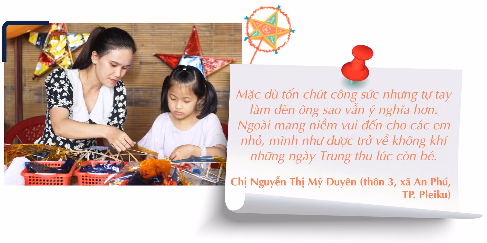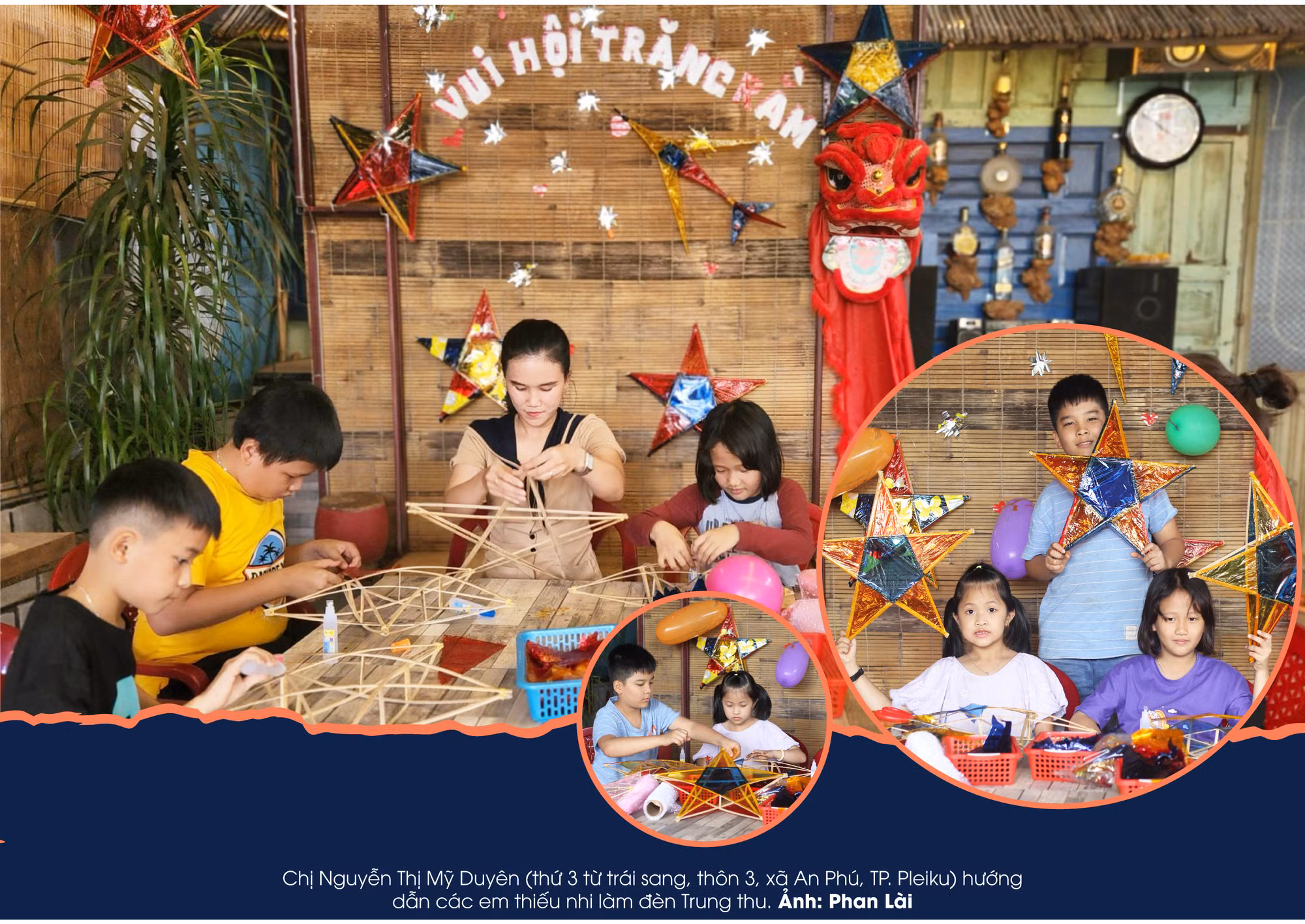 Buổi sáng cuối tuần, tại quán Thiên Ân (thôn 3, xã An Phú, TP. Pleiku), các em thiếu nhi tập trung ngồi làm lồng đèn ông sao dưới sự hướng dẫn của chị Nguyễn Thị Mỹ Duyên. Vật liệu để làm lồng đèn là các thanh tre đã được vót sẵn, keo dán, giấy màu bóng, giấy trang trí… Các em cẩn thận lắp những thanh tre thành hình ngôi sao rồi dán giấy, trang trí. Qua các công đoạn, những chiếc đèn ông sao rực rỡ sắc màu đã thành hình. Em Phan Đình Khánh (lớp 6/4, Trường THCS Ngô Gia Tự, xã An Phú) chia sẻ: “Với sự hướng dẫn của cô Duyên, chỉ sau khoảng 15 phút, em đã làm được một chiếc đèn ông sao. Tuy không bằng lồng đèn bày bán ngoài chợ nhưng em vẫn thích chiếc đèn ông sao do mình tự tay làm”.