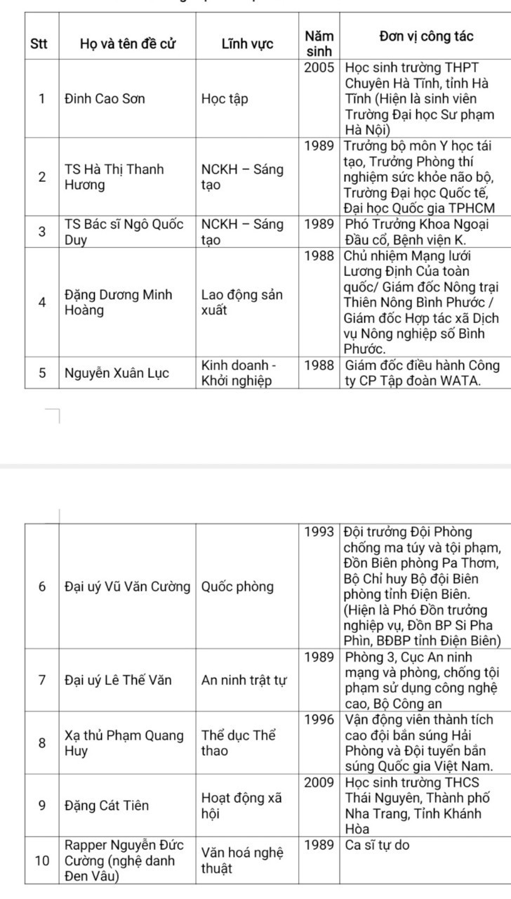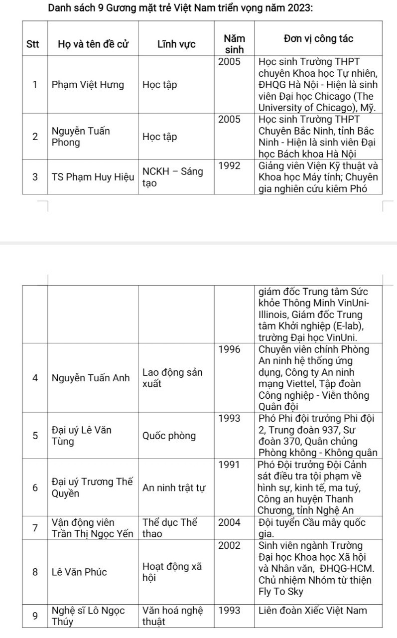 Danh sách 10 Gương mặt trẻ Việt Nam tiểu biểu năm 2023 gồm: