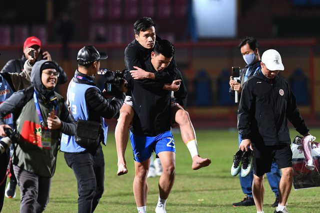| Hoàng Đức phải rời sân bằng cáng sau va vào bóng của Văn Toản. Ảnh: Minh Hoàng |