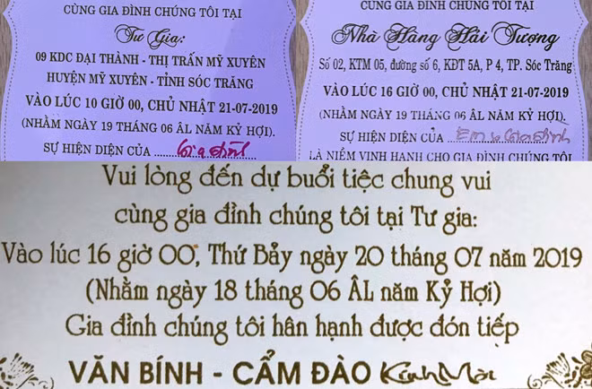 Thiệp cưới bà Đào mời khách dự tiệc 16h ngày 20/7, 10h ngày 21/7 và 16h ngày 21/7. Ngoài ra, bà Đào đã đãi tiệc với sự có mặt của Bí thư Tỉnh ủy Sóc Trăng Phan Văn Sáu vào chiều 19/7. Ảnh: Việt Tường.