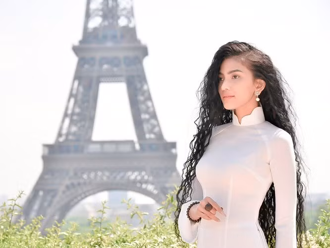 | Trong chuyến đi mới đây, Trương Thị May đã diện bộ áo dài khi đến thăm tháp Eiffel – kì quan nổi tiếng của Pháp |