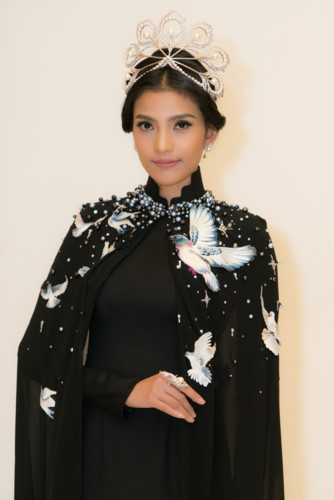 Trương Thị May xuất hiện ấn tượng với áo dài và bản sao vương miện Mikimoto của cuộc thi Hoa hậu Hoàn vũ thế giới.