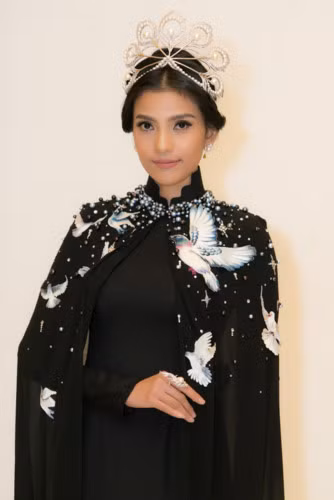 | Đặc biệt hơn, bản sao chiếc vương miện Mikimoto nổi tiếng của cuộc thi Hoa hậu hoàn vũ thế giới cũng được cô đội trên đầu khi trình diễn thời trang. |