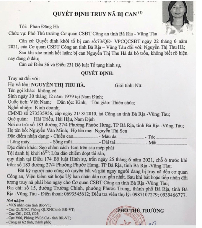 Cơ quan CSĐT Công an tỉnh Bà Rịa – Vũng Tàu vừa có quyết định truy nã đối với Nguyễn Thị Thu Hà (42 tuổi, ngụ TP Bà Rịa, tỉnh Bà Rịa – Vũng Tàu) liên quan đến vụ án "Lừa đảo chiếm đoạt tài sản" tại dự án "khu dân cư số 1 Tây Nam", thị trấn Long Điền, huyện Long Điền do Công ty CP phát triển nhà Ô Cấp làm chủ đầu tư.