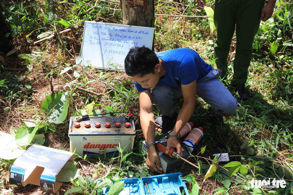 Ngô Văn Diệm thực hiện lại động tác khoan cây thông trước khi đổ thuốc diệt cỏ vào - Ảnh: M.VINH