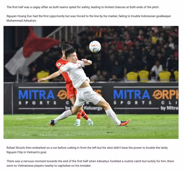 "Tuyển Việt Nam có cơ hội dứt để tấn công đối thủ trong hiệp đấu thứ nhất nhưng không thể tận dụng thành công để ghi bàn. Hai đội trình diễn màn đôi công kịch tính xuyên suốt 45 phút thi đấu song Indonesia biết cách tăng tốc, tạo đột biến ở hiệp đấu thứ 2 và ghi bàn duy nhất của trận đấu.