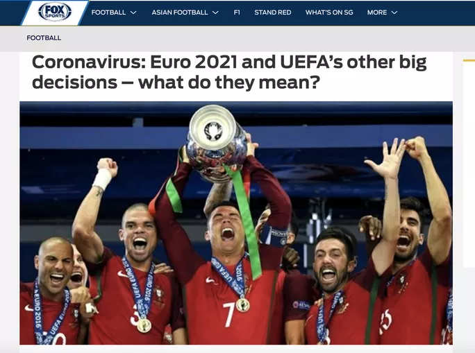 Trang FoxSportAsia phân tích kỹ hành động của UEFA trong bài viết "Coronavirus: EURO 2021 và các quyết định của UEFA có ý nghĩa gì", xoay quanh việc chuyển EURO 2020 thành EURO 2021 vì tình hình dịch bệnh, cũng nhằm tạo điều kiện về thời gian để các giải VĐQG hoàn thành đúng tiến độ. Nhiều giải đấu hàng đầu như Giải Vô địch nữ châu Âu 2021, Giải Vô địch U21, Nations League 2020-2021… bị ảnh hưởng đến lịch trình tổ chức nhưng nhất thiết phải làm, kể cả World Cup các CLB 2021.